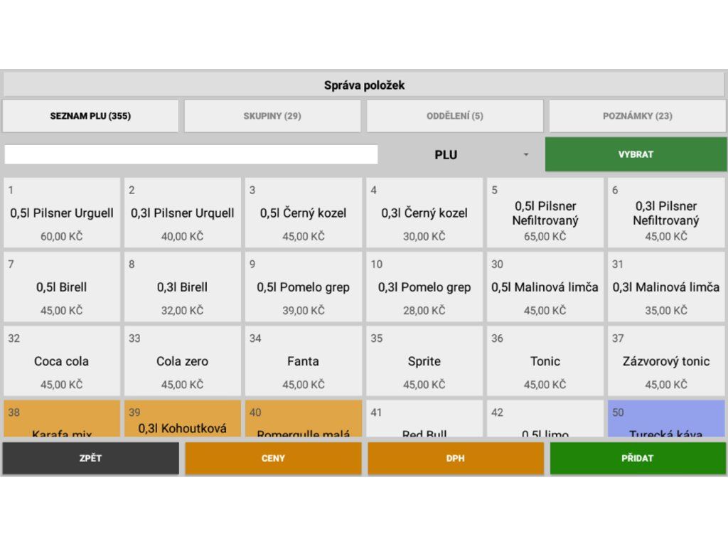 o Výběr položek z předem nastavených skuin zboží MENU Poléky nebo MENU jídla