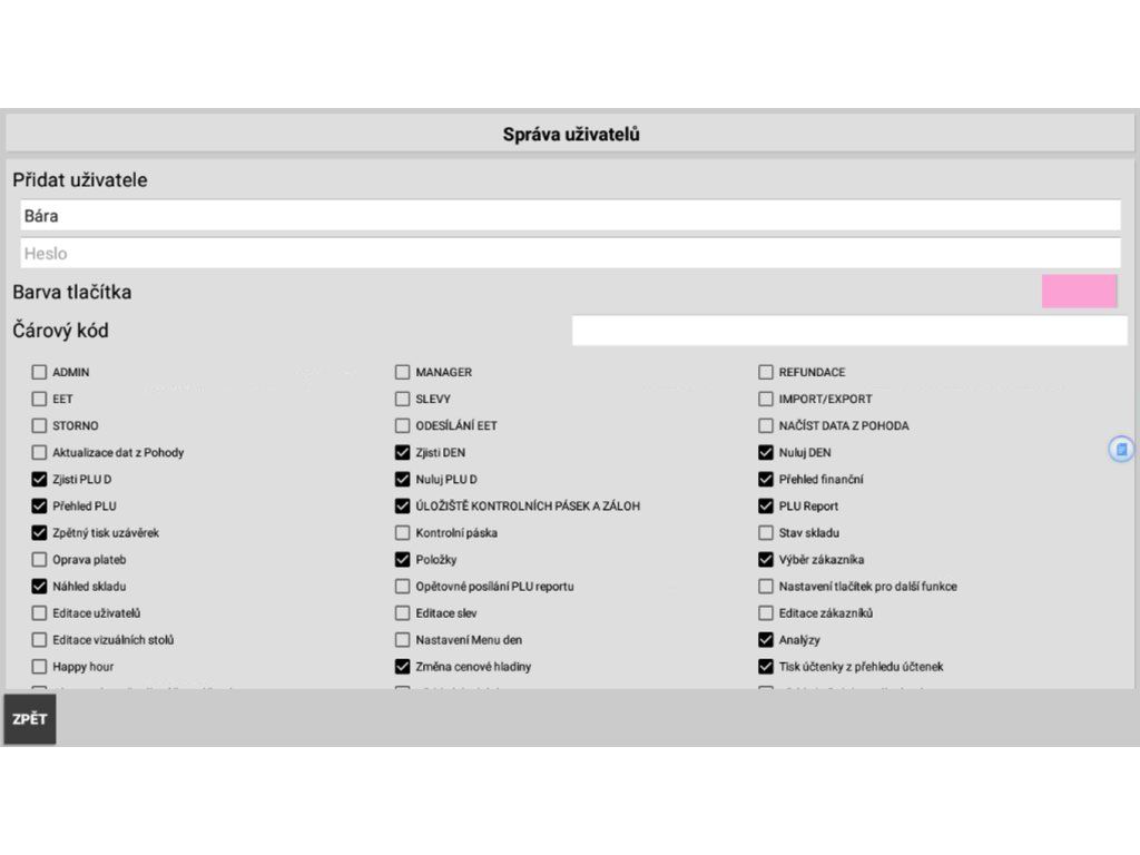 o Možnost nastavení Jmen, Hesel a práv pro pokladníky