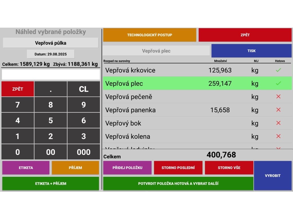 Do této aplikace se přenáší rozpad surovin dle potřeby při bourání hovězího, vepřového, kuřecího masa